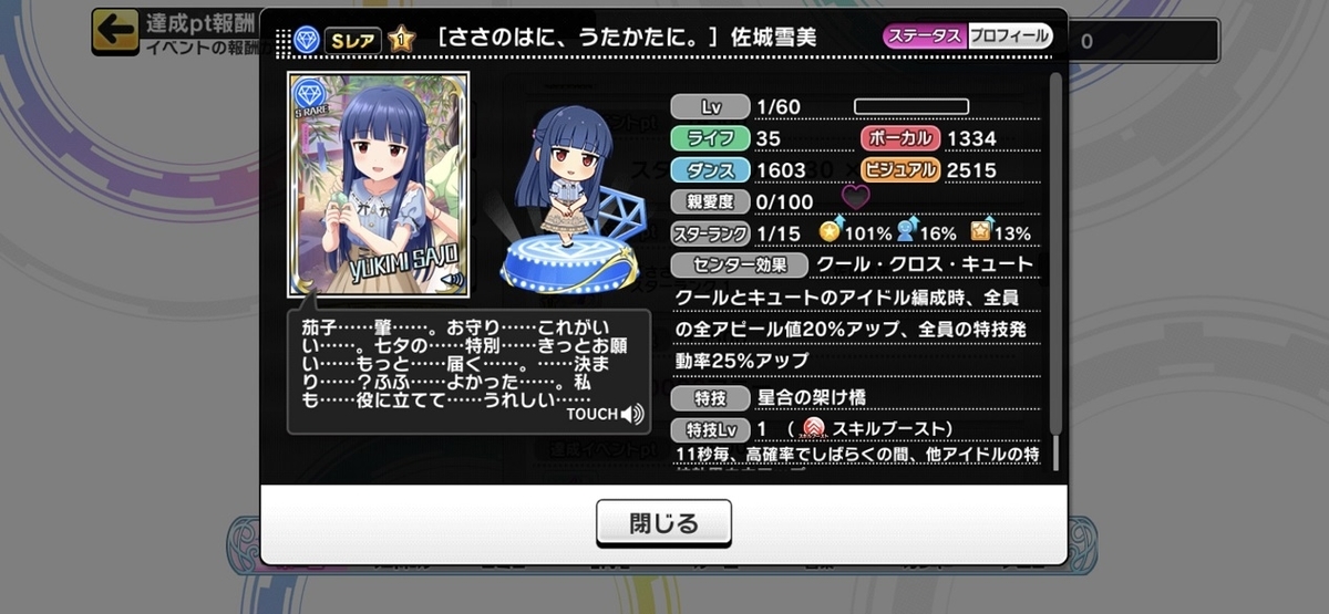 加えて、カムバックSRスカウトチケットを使うことで任意の獲得済みSRをスカウトすることができる(同カードのスカウトは年1回まで)ので、これとプレミアムパスの獲得分を合わせると10001位~20000位であってもスタラン15が可能です。